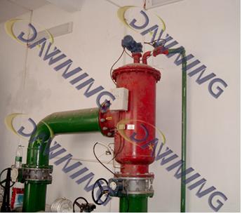 現(xiàn)場安裝圖,圖中立式自清洗過濾器室內(nèi)安裝,下進側(cè)出,右邊小管道與排污口連接方便導(dǎo)出排出的雜質(zhì)。