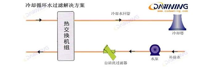 我們?yōu)槠涮峁┑倪^濾解決方案解決這一問題,如上面流程圖所示,我們?cè)谒煤蛽Q熱器之間設(shè)備一臺(tái)自清洗過濾器(電動(dòng)刷式過濾器或電動(dòng)式自動(dòng)排污過濾器),根據(jù)現(xiàn)場(chǎng)實(shí)際情況,選擇相應(yīng)的過濾網(wǎng)和過濾精度,這些將保證在不影響水系統(tǒng)正常運(yùn)行的狀況下,自清洗過濾器會(huì)過濾掉符合精度的所有雜質(zhì),并在設(shè)定的壓差或時(shí)間范圍內(nèi)自動(dòng)清洗濾網(wǎng)、自動(dòng)排污。自清洗過濾器的設(shè)置,將大大提高系統(tǒng)的換熱效率、減少系統(tǒng)補(bǔ)水量、提高水的濃縮比,達(dá)到節(jié)水、節(jié)能、環(huán)保的目的。
