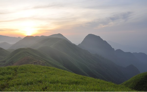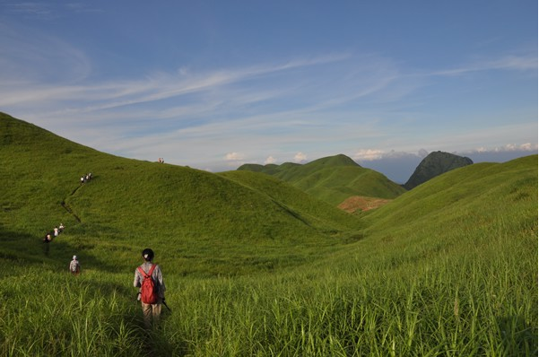 武功山的風(fēng)景很美,特別是云霧繚繞,陽光跳躍的時候。深淺不一的草甸,輕紗薄霧繚繞的山頭。